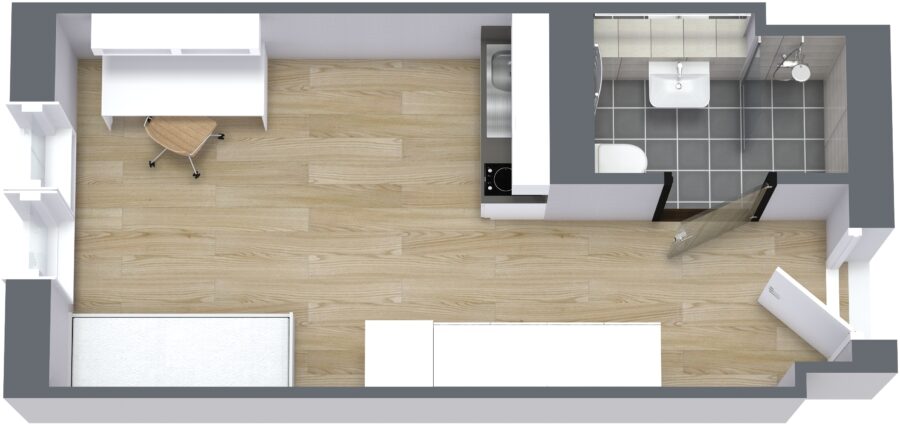 Im Wohn-/Schlafbereich befindet sich ein komfortables Einzelbett (90 x 200 cm) mit Lattenrost und Matratze, ergänzt durch einen geräumigen Kleiderschrank, einen Schreibtisch mit Stuhl sowie offene Regale und Ablageflächen. Damit bietet jedes Apartment ausreichend Platz zum Schlafen, Lernen und Entspannen. Große Fenster sorgen für eine helle, freundliche Atmosphäre und viel Tageslicht. Die Apartments verfügen über einen robusten, pflegeleichten Bodenbelag in Holzoptik, der dem Raum eine moderne und wohnliche Note verleiht.