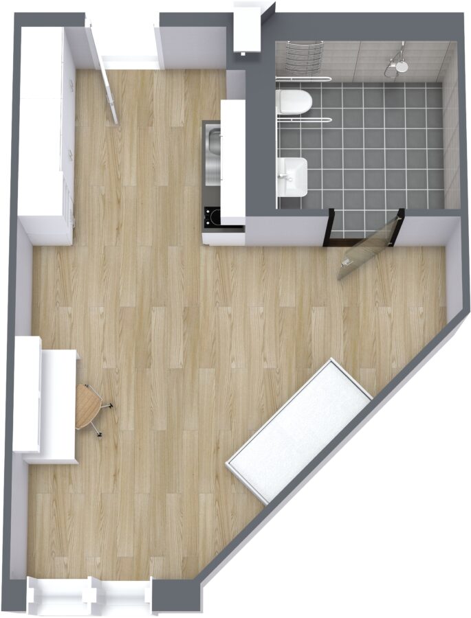 Im Wohn-/Schlafbereich befindet sich ein komfortables Einzelbett (90 x 200 cm) mit Lattenrost und Matratze, ergänzt durch einen geräumigen Kleiderschrank, einen Schreibtisch mit Stuhl sowie offene Regale und Ablageflächen. Damit bietet jedes Apartment ausreichend Platz zum Schlafen, Lernen und Entspannen. Große Fenster sorgen für eine helle, freundliche Atmosphäre und viel Tageslicht. Die Apartments verfügen über einen robusten, pflegeleichten Bodenbelag in Holzoptik, der dem Raum eine moderne und wohnliche Note verleiht.