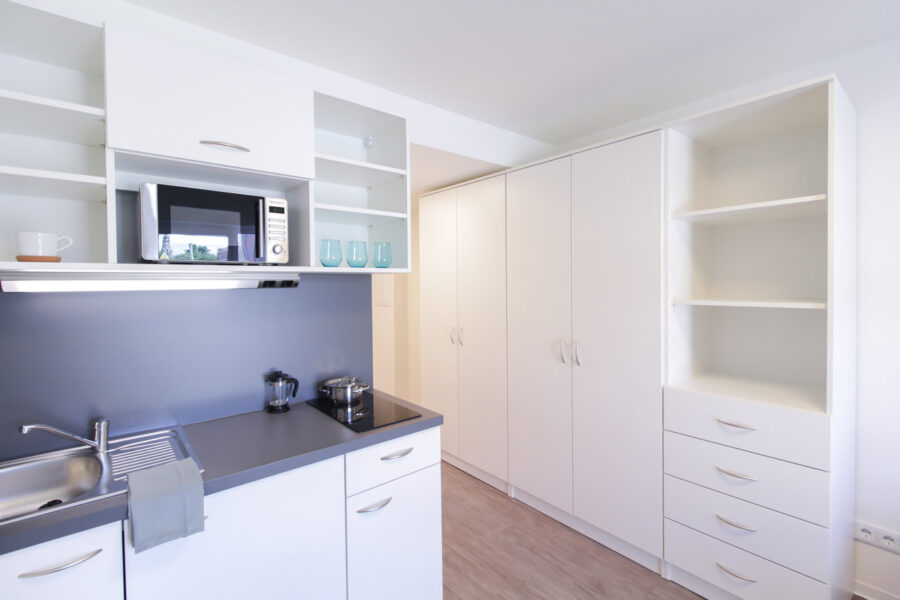 Ein besonderes Highlight ist die integrierte Pantryküche, die mit allem ausgestattet ist, was man zum Kochen braucht: ein Kühlschrank mit Gefrierfach, zwei Cerankochfelder, eine Mikrowelle mit Grillfunktion sowie ausreichend Stauraum für Geschirr und Vorräte. Die Küchenzeile ist kompakt, aber funktional – ideal für schnelle Mahlzeiten zwischen den Vorlesungen.