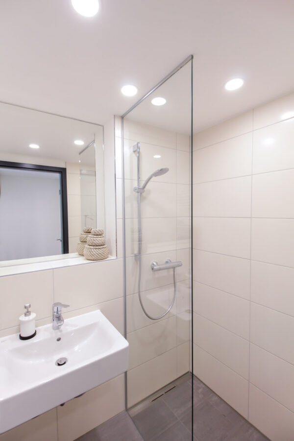 Das eigene Badezimmer ist modern gefliest und mit einer Dusche, einem Waschbecken und einem wandhängenden WC ausgestattet. Ein Spiegelschrank sowie Ablagen bieten zusätzlichen Stauraum für Pflegeprodukte und Hygieneartikel.